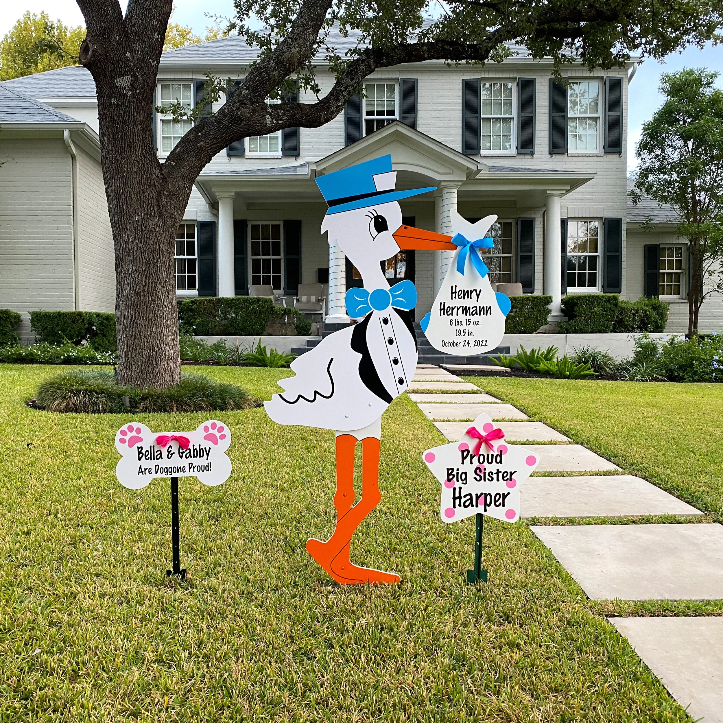 Our birth announcement storks include a 7-day rental with optional add on’s including sibling and dog/cat signs. Baby is here and you’re ready to order today? Click here!